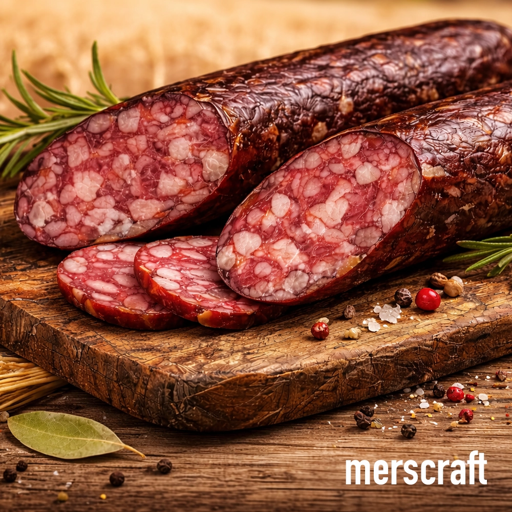 Виготовлена тільки з найкращих інгредієнтів: яловичина вищого ґатунку, свинина та якісний шпик. Натуральні спеції (чорний перець, мускатний горіх, часник) та традиційна технологія сиров’ялення без варіння роблять цю ковбасу справжнім делікатесом для поціновувачів.