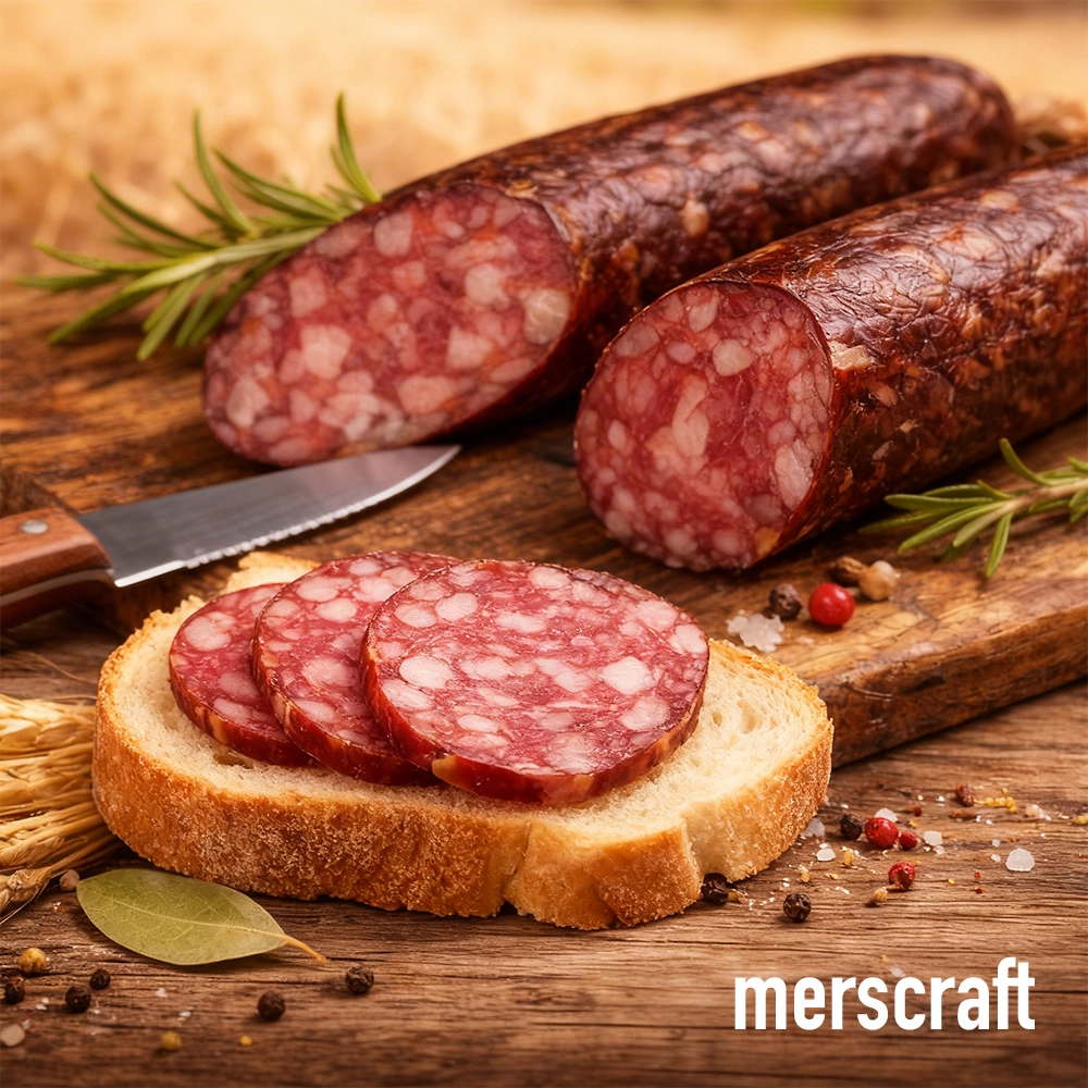 Ковбаса “Поділля Прайм” (сиров’ялена) MERSCRAFT — преміальна сиров’ялена ковбаса з глибоким м’ясним смаком, витонченими спеціями та благородним ароматом натурального копчення.